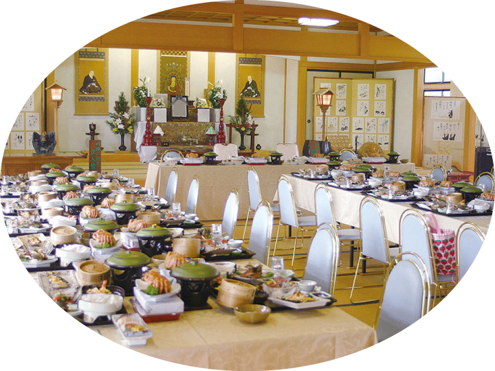 吉祥閣<きちじょうかく> 初七日、二七日、三七日、四七日、五七日、七七日(四十九日)、百カ日、一周忌、三回忌、七回忌、十三回忌、二十七回忌、三十三回忌、五十回忌、百回忌法要が行われます。 吉祥閣 床の間 百畳敷の客間 冷暖房完備! 縁起の廊下 本堂へと続く廊下には、縁起がいいとされる動物たちの置物がずらり。